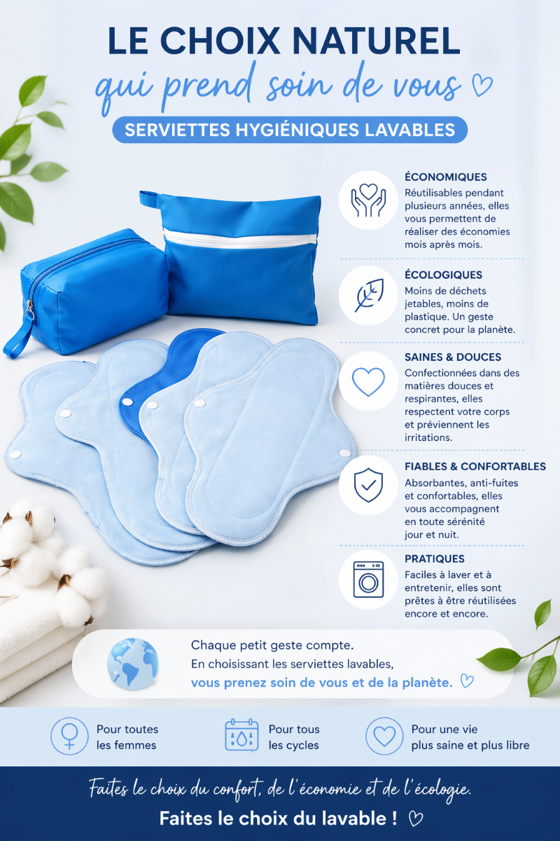 SERVIETTES HYGIÉNIQUES LAVABLES – MA SERVIETTE BIO 🚨 Ce que beaucoup de femmes ignorent : Les serviettes jetables contiennent souvent des produits chimiques qui peuvent provoquer irritations, démangeaisons et infections à long terme. 💚 La solution saine et durable ? Les serviettes hygiéniques lavables Ma Serviette Bio respectent ton corps et protègent ta santé intime. ✨ Pourquoi choisir Ma Serviette Bio ? ✔️ Douces et confortables ✔️ Sans substances nocives ✔️ Réutilisables pendant plusieurs années ✔️ Économiques (un seul achat, fini les dépenses chaque mois) ✔️ Écologiques 🌍 📦 Pack de 5 serviettes 👉 Prends soin de toi, pas seulement pendant tes règles, mais pour ta santé future.