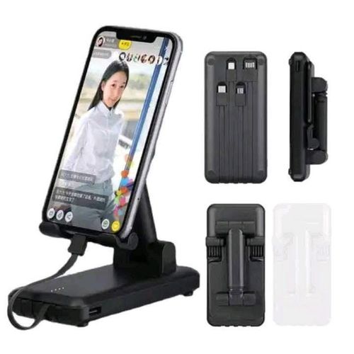 Pratique comme chargeur de téléphone ! Cette puissante batterie externe de 10000 mAh en ABS dispose d'un support de téléphone intégré et de plusieurs câbles.