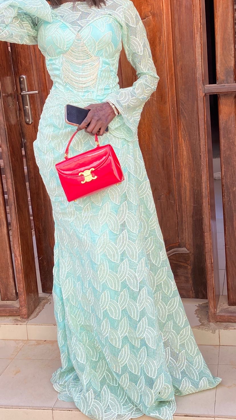 C’est une robe très élégante longue avec une forme d’attache sur la ceinture qui dessine la taille