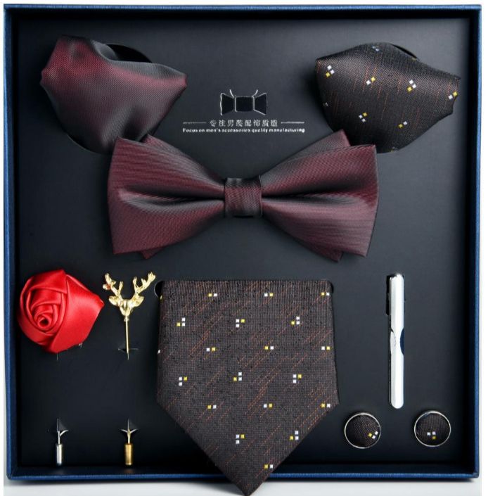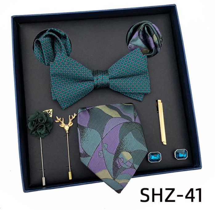 Coffret cravate 8 pieces: cravate, un noeud, une pince a cravata, une broche et un lapel florel, manchette, 2 mouchoirs