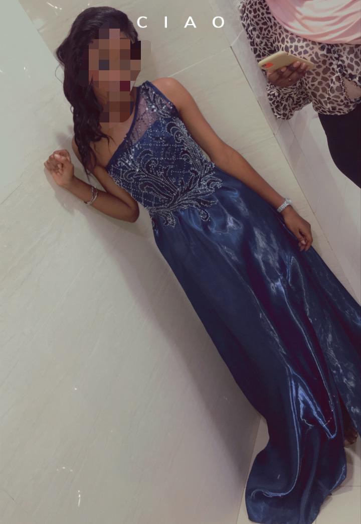 Robe de soirée bleue évasée( en soie) avec fente portée une seule fois