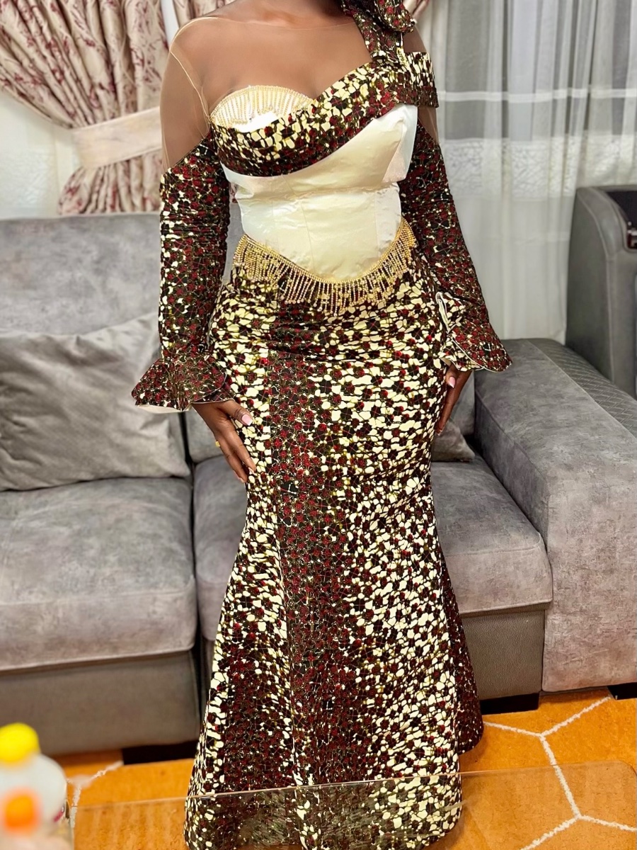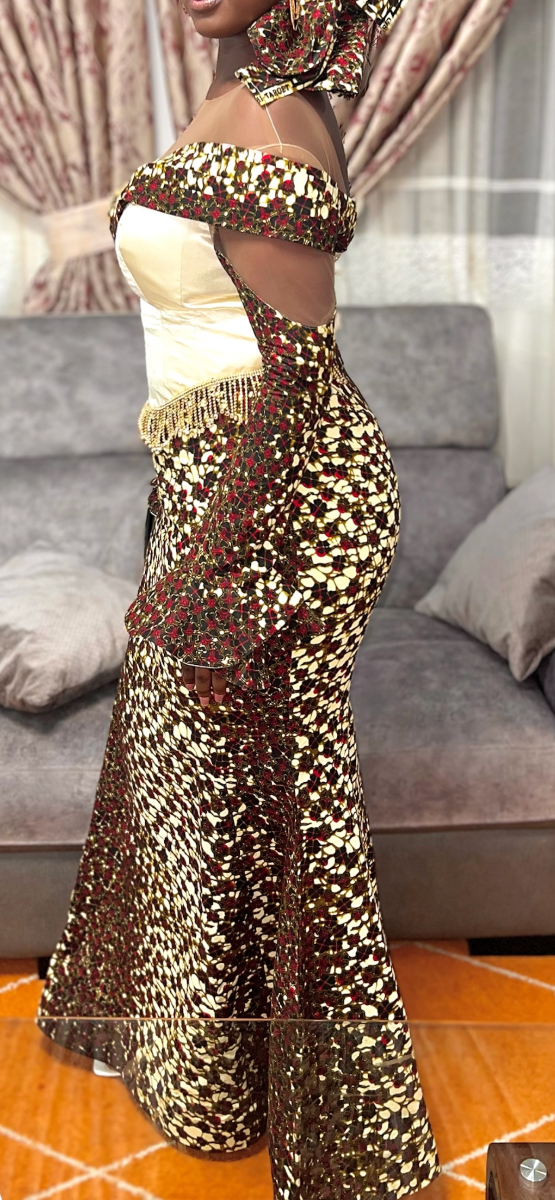 Robe longue élégante en wax Robe chic à coupe ajustée, avec une épaule dénudée et un buste satiné qui met en valeur la silhouette. Détails perlés à la taille pour une touche raffinée. Parfaite pour cérémonies et événements.
