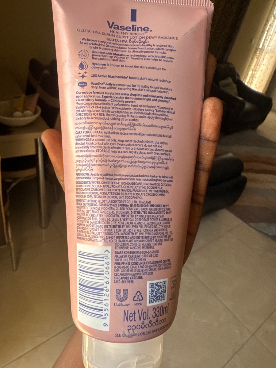 Détails des produits : • Gamme : Healthy Bright – Gluta-Hya Serum Burst Lotion • Contenance : 330 ml chacun • Couleurs : • Deux tubes roses (à gauche et à droite) : Dewy Radiance → pour une peau lumineuse et hydratée • Un tube doré/jaune (au centre) : Flawless Bright → cible les taches et unifie le teint Ingrédients mis en avant : • GlutaGlow (éclaircissant) • Acide hyaluronique (Hyaluron) (hydratation intense) • Niacinamide (éclat + correction du teint) • Mention marketing : “10x more powerful than Vitamin C”